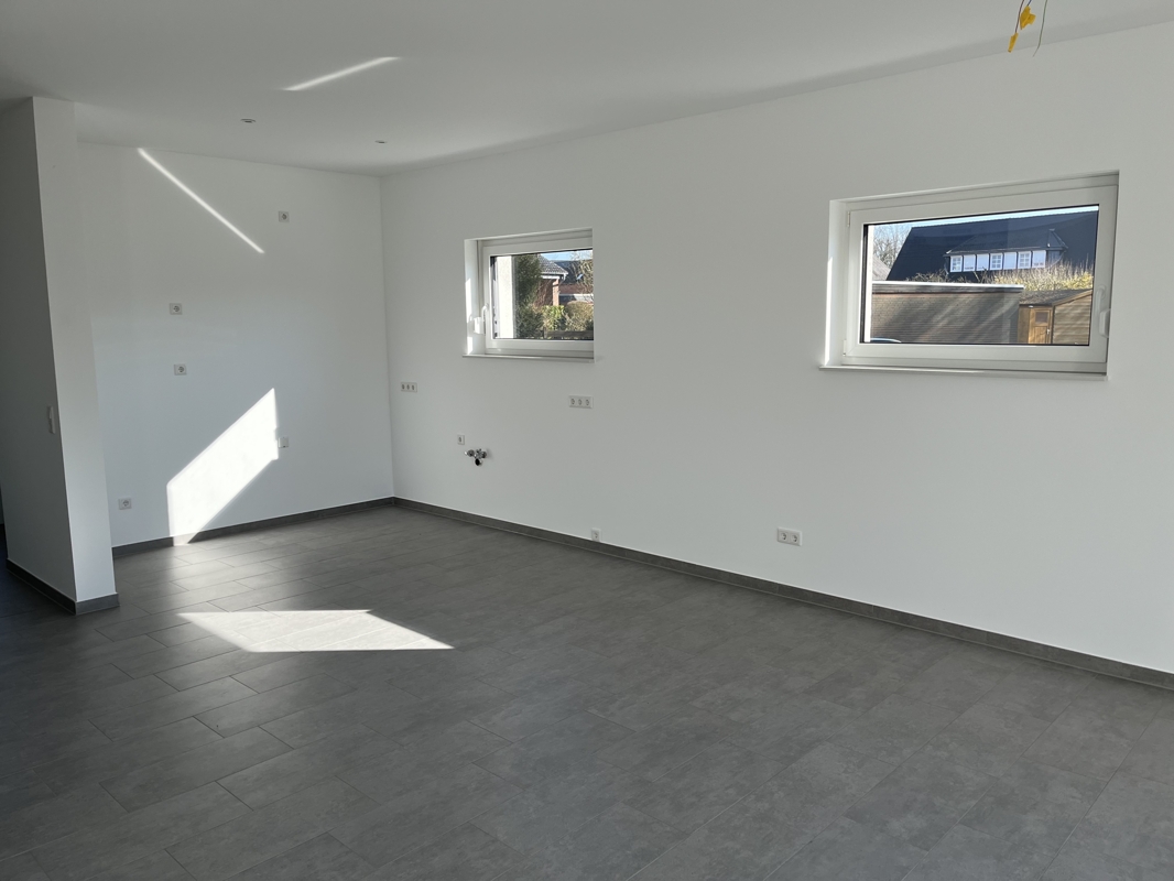 Im Erdgeschoss liegen rechts und links von der Diele der Hauswirtschaftsraum und das Gästebad. An die Diele anschließend befindet sich das großzügige Wohn- und Esszimmer mit dem Küchenbereich. In Kürze wird die neue, individuell geplante, mit hellen Fronten ausgestattete Einbauküche geliefert und installiert.