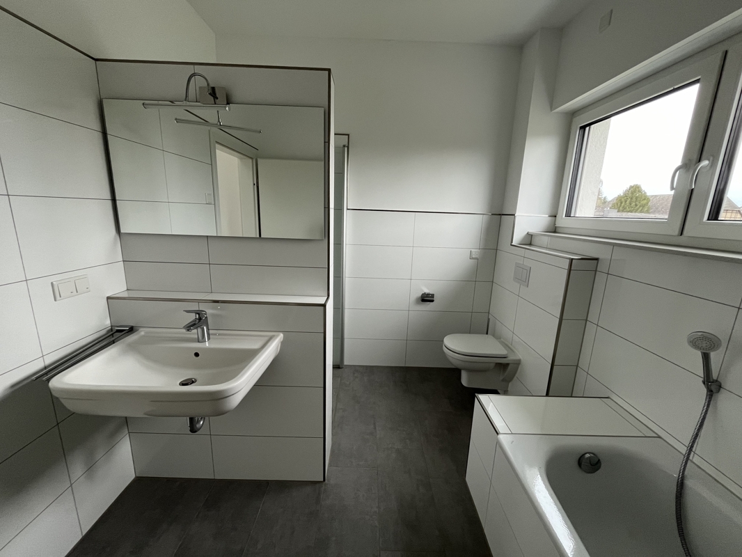 Im Obergeschoss sind das Schlafzimmer sowie das Kinderzimmer und das Bad vorhanden. Das ca. 20 m² große Schlafzimmer ist so geräumig, dass z.B. ein begehbarer Kleiderschrank oder ein Home-Office-Arbeitsplatz gestaltet werden kann. Das Badezimmer ist mit Waschtisch, WC, Badewanne und Dusche ausgestattet. Mit weißen Wandfliesen, grauen Bodenfliesen und weißen Sanitärobjekten wirkt es modern und schick, ist aber gleichzeitig neutral und zeitlos.